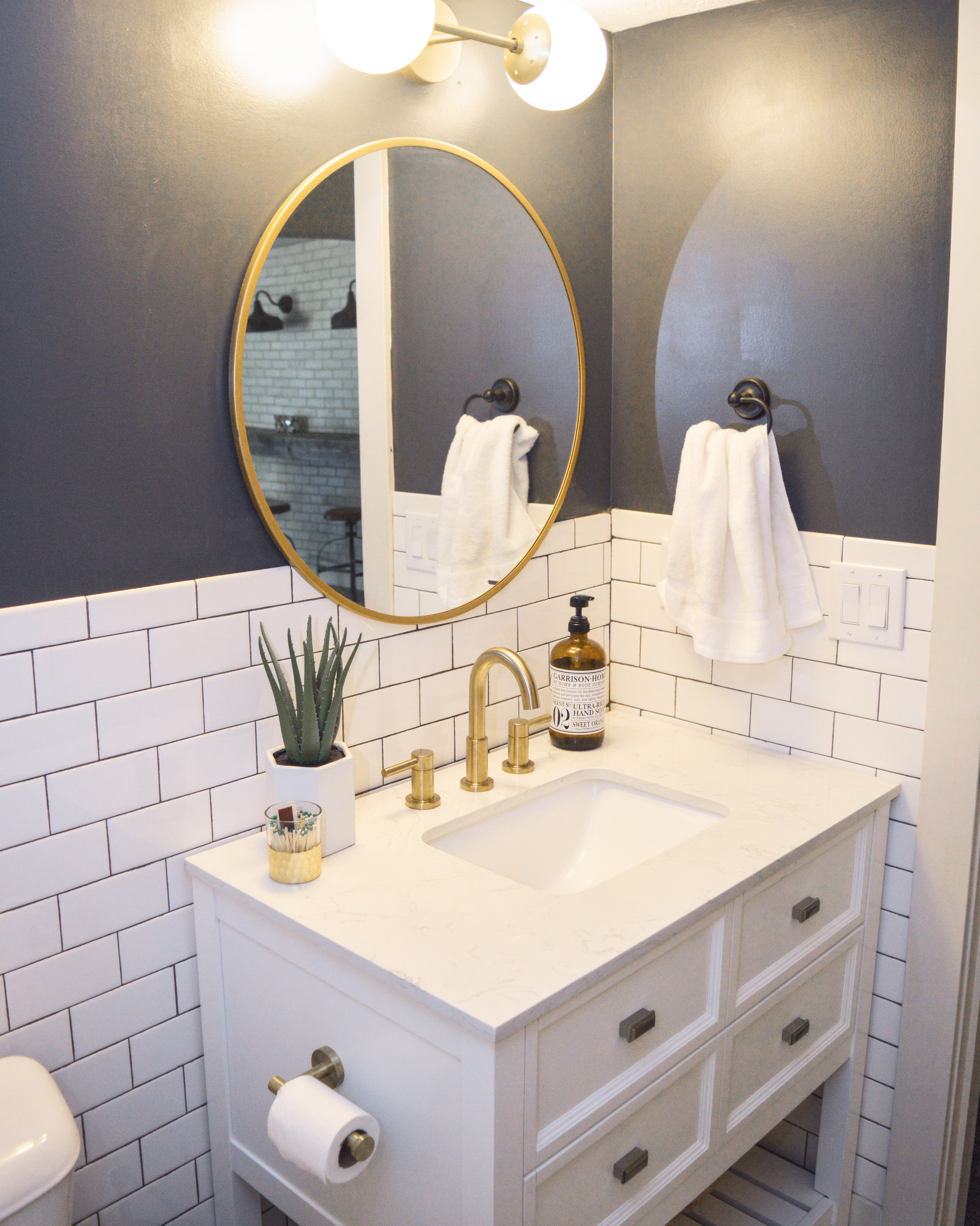 I love the look of full tiled bathrooms! They feel so fancy and over all, it’s a huge statement. I wanted to add some color though, instead of it being all stark white– and by color, I mean dark charcoal walls. I thought the dark walls and white subway tiles would be a good contrast together! I love the end result!