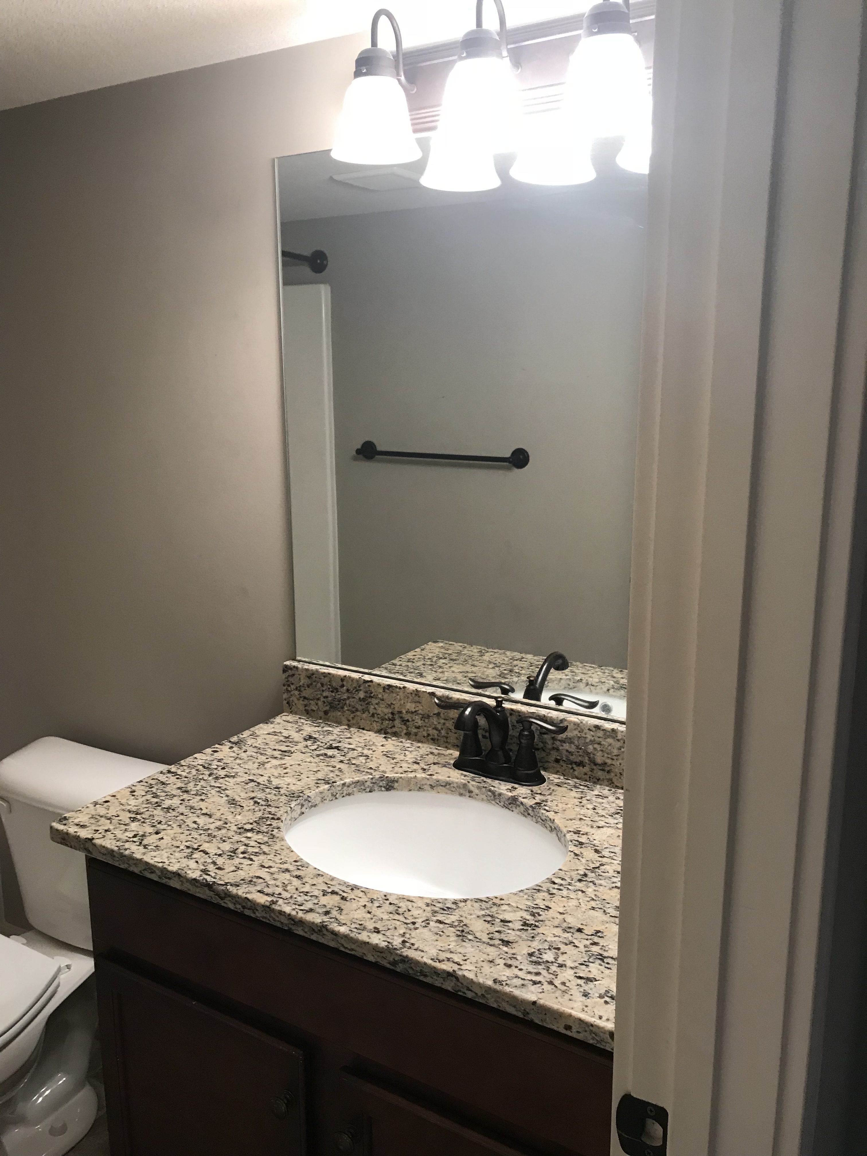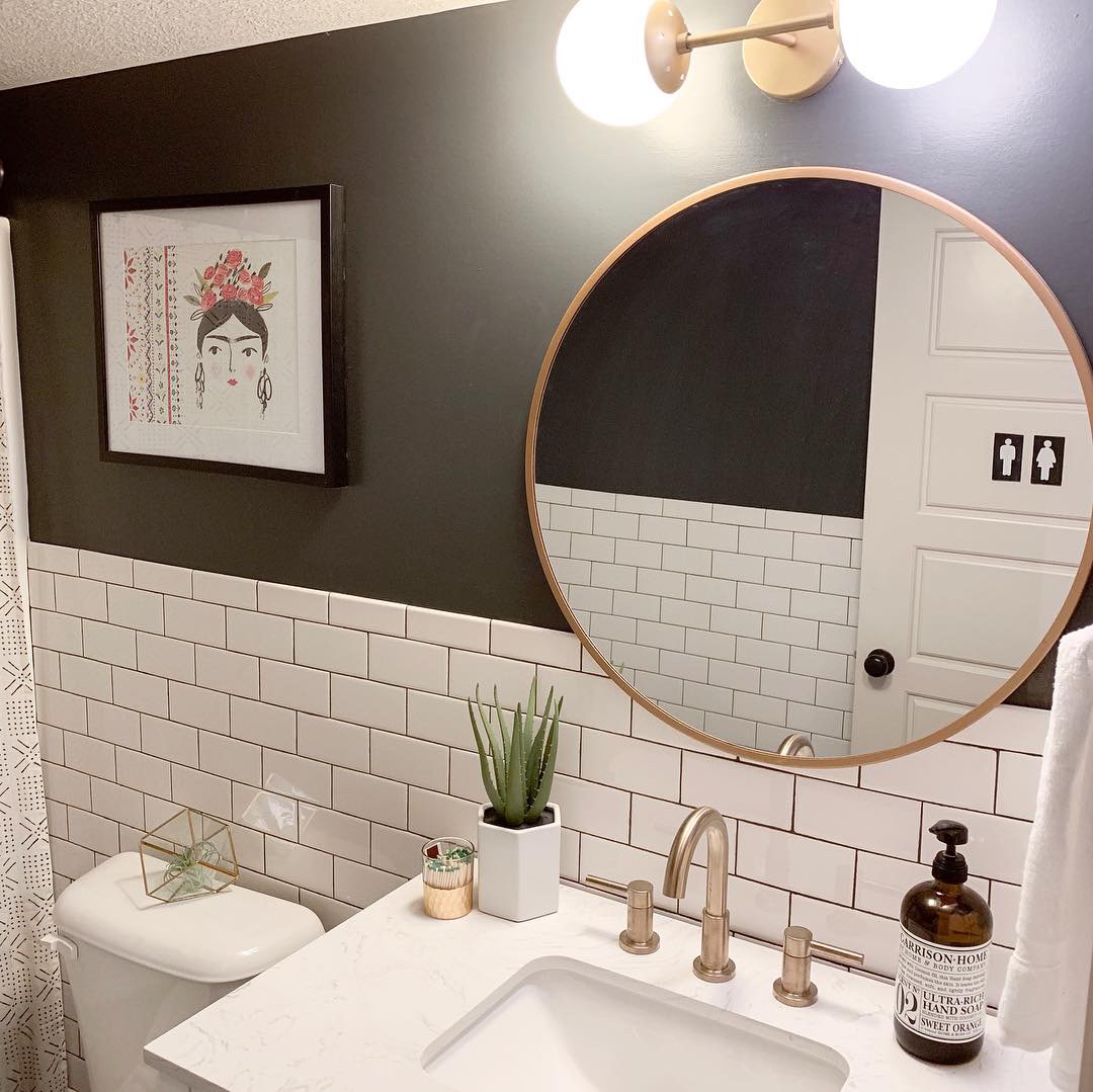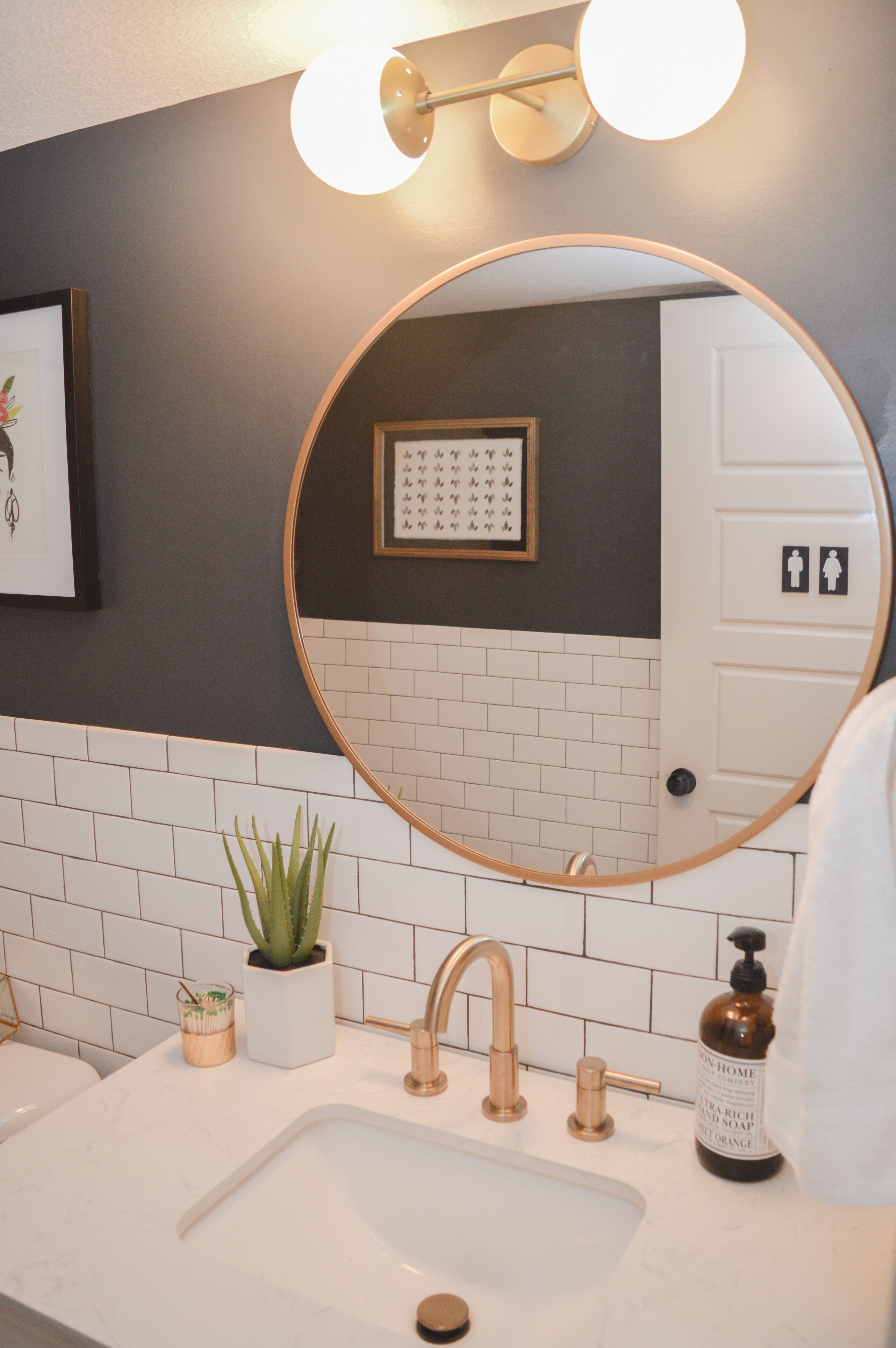 Our basement bathroom was as builder grade as it gets. We built our house in October 2015, and it already looked dated a couple years later. From the glued on frame-less mirror and dark wood base cabinet, to the standard porcelain light fixture… It ‘had-ta-go’.